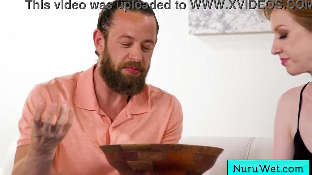 Blonde masseuse Sonia Harcourt delivers wet nuru massage, rubbing natural tits on client Brad Newman's back