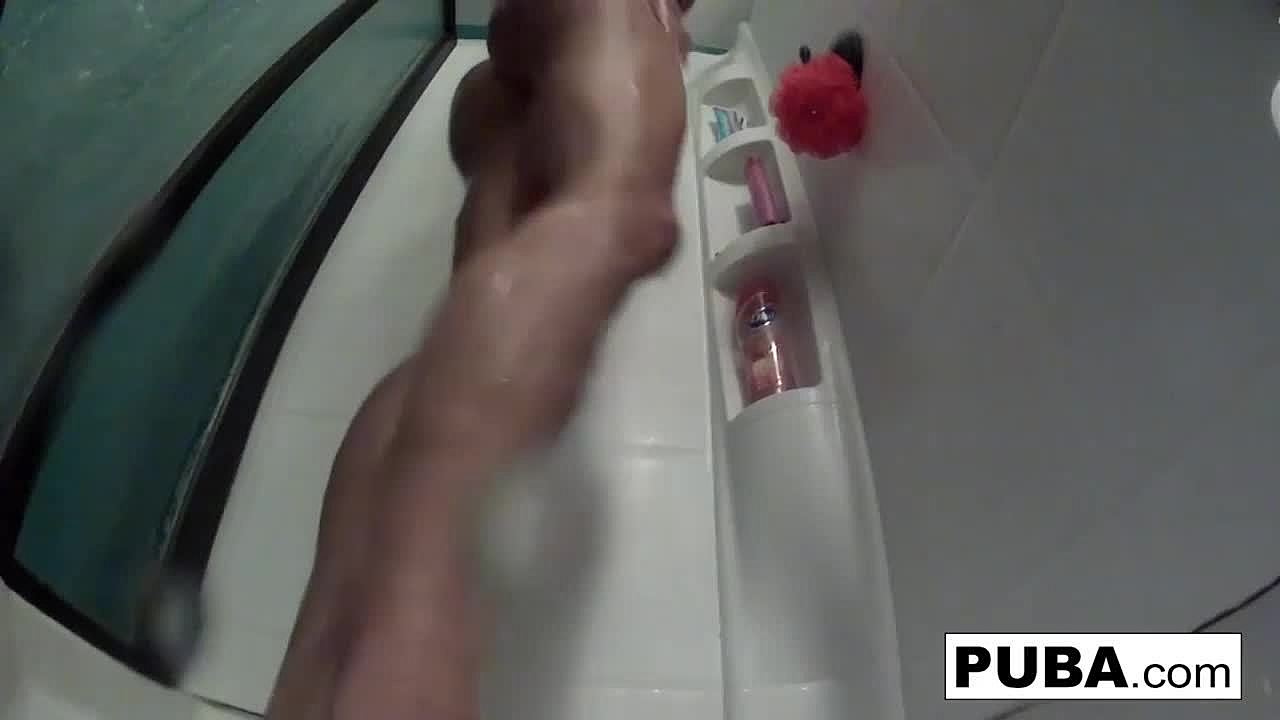 Cute blonde enjoys a relaxing shower after her interview.