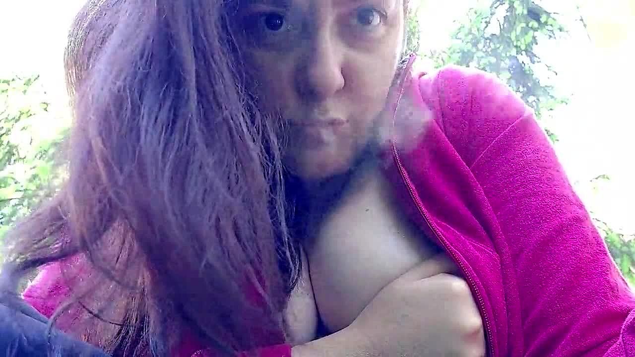big melons babe teases with outdoor nipple play in public.